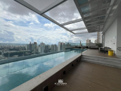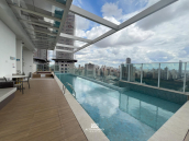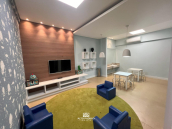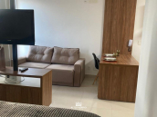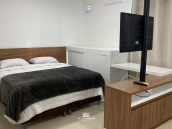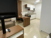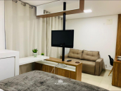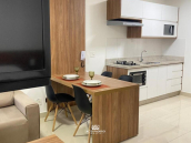 Flat mobiliado de 34m² com 1 suíte, cozinha integrada à sala e 1 vaga de garagem.