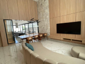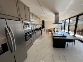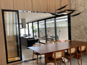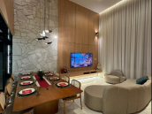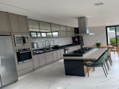 -Casa toda decorada com mesas, lustre, cristaleira, sofá, cortina, painel, coifa, sofá;